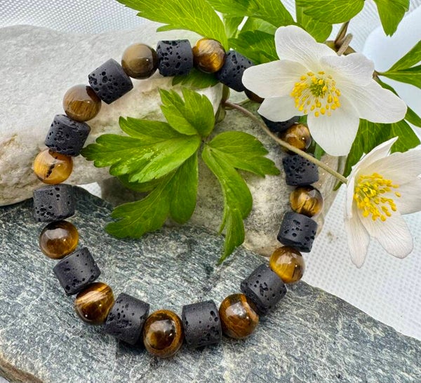 Tigerøye + Lavastein forbindes med styrke, beskyttelse og jording. Tigerøye sies å gi mot, fokus og selvtillit, mens lavastein står for ro, stabilitet og jordnær energi. Sammen symboliserer de balanse mellom handlekraft og indre ro. Et armbånd mange bruker som en påminnelse om å stå stødig, tenke klart og møte utfordringer med styrke.